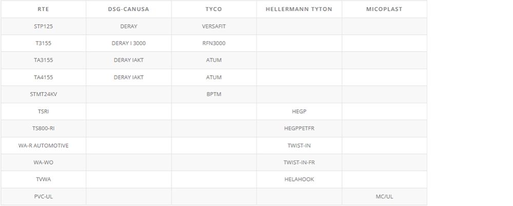Nota: Questa è solo una tabella indicativa, in alcuni casi i Ns. prodotti potrebbero non essere esattamente equivalenti a quanto indicato. Pertanto, prima di acquistare ed utilizzare le Ns. guaine, in alternativa a quelle di altri produttori, vi suggeriamo di contattarci per una verifica.